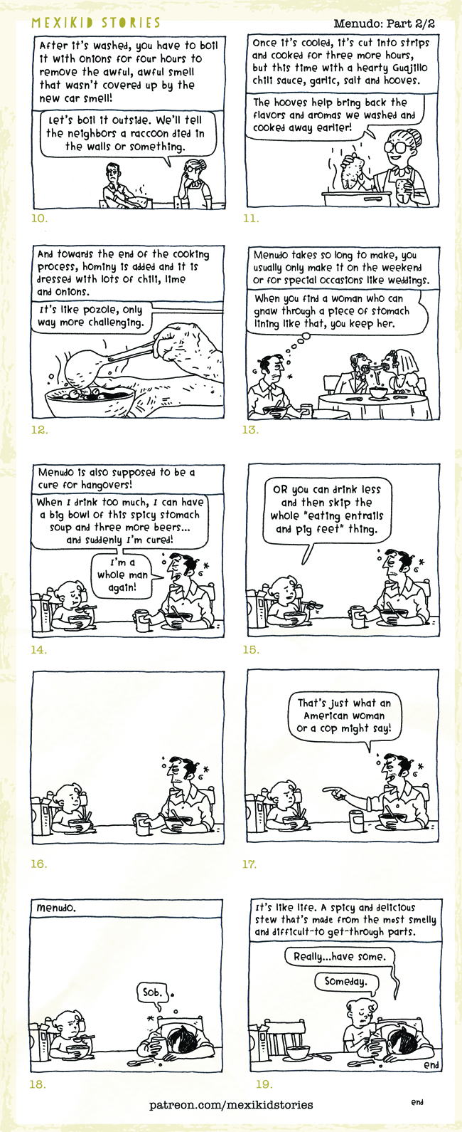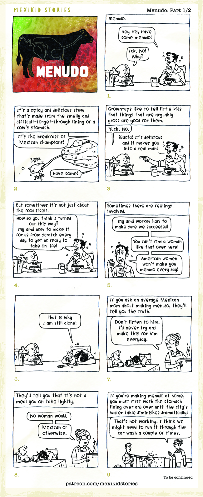 Creata da Pedro Martin, la serie "Mexikid Stories" raccoglie le memorie della sua infanzia messicano-americana. Cresciuto in California negli anni settanta ed ottanta, nelle sue vignette Pedro illustra storie che - come ama dire l'artista - "sono vere al 100%, il 90% delle volte". Questa ripubblicata qui sotto documenta la sua esperienza di bambino col menudo, la tradizionale zuppa di trippa alla messicana. La collezione completa delle "Mexikid Stories" si trova su Instagram (@mexikidstories) o sul sito Mexikid.com. E c'è anche il libro "Mexikid - A Graphic Novel" di Penguin Dial (disponibile a partire da agosto 2023).